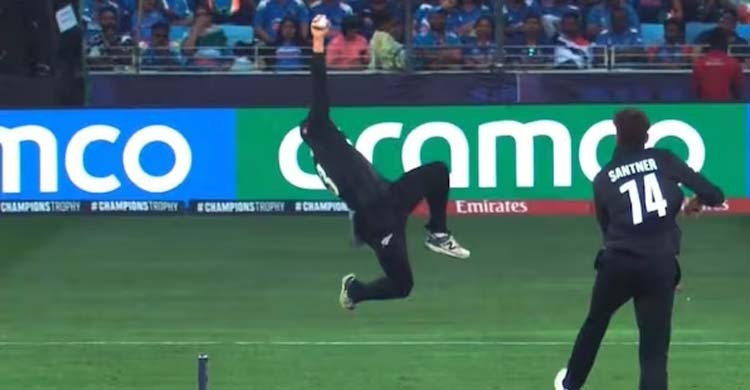 নিউজিল্যান্ড স্পিনার মিচেল স্যান্টনারের বলে শর্ট এক্সট্রা কভার অঞ্চলে ড্রাইভ করছিলেন ভারতীয় ওপেনার শুভমান গিল। ডানহাতির ব্যাটারের ব্যাট থেকে আসা বলের দিকে ঈগল পাখির মতো তীক্ষ্ম লক্ষ্য রেখে বাতাসে ভাসলেন ফিলিপস। মাথার কয়েক ফুট উপর দিয়ে গতিপথ তৈরি করা বলকে বাজপাখির মতো ছোঁ দিয়ে ধরে ফেললেন তিনি।
