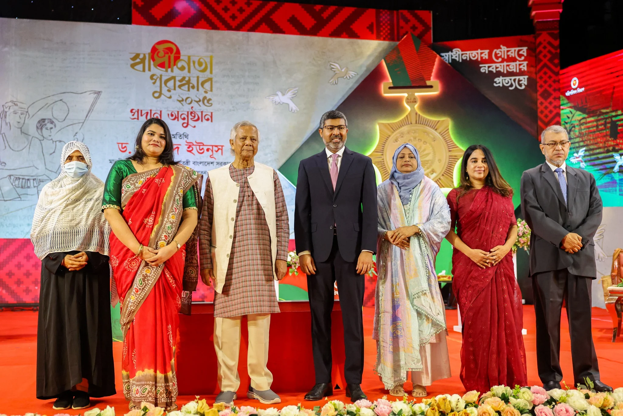 অন্তর্বর্তীকালীন সরকারের প্রধান উপদেষ্টা অধ্যাপক ড. মুহাম্মদ ইউনূস জাতীয় পর্যায়ে নিজ নিজ ক্ষেত্রে অসামান্য অবদানের স্বীকৃতিস্বরূপ সাত বিশিষ্ট ব্যক্তির হাতে ‘স্বাধীনতা পুরস্কার-২০২৫’ তুলে দিয়েছেন।